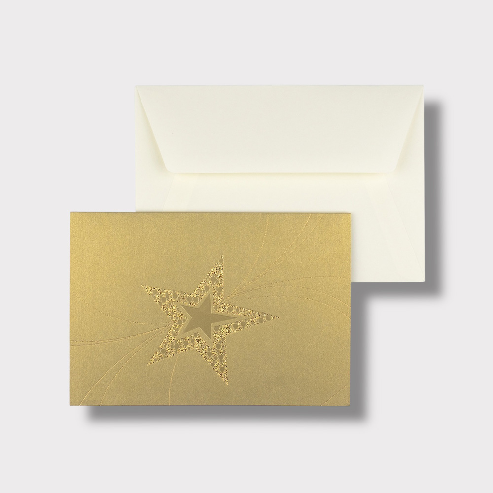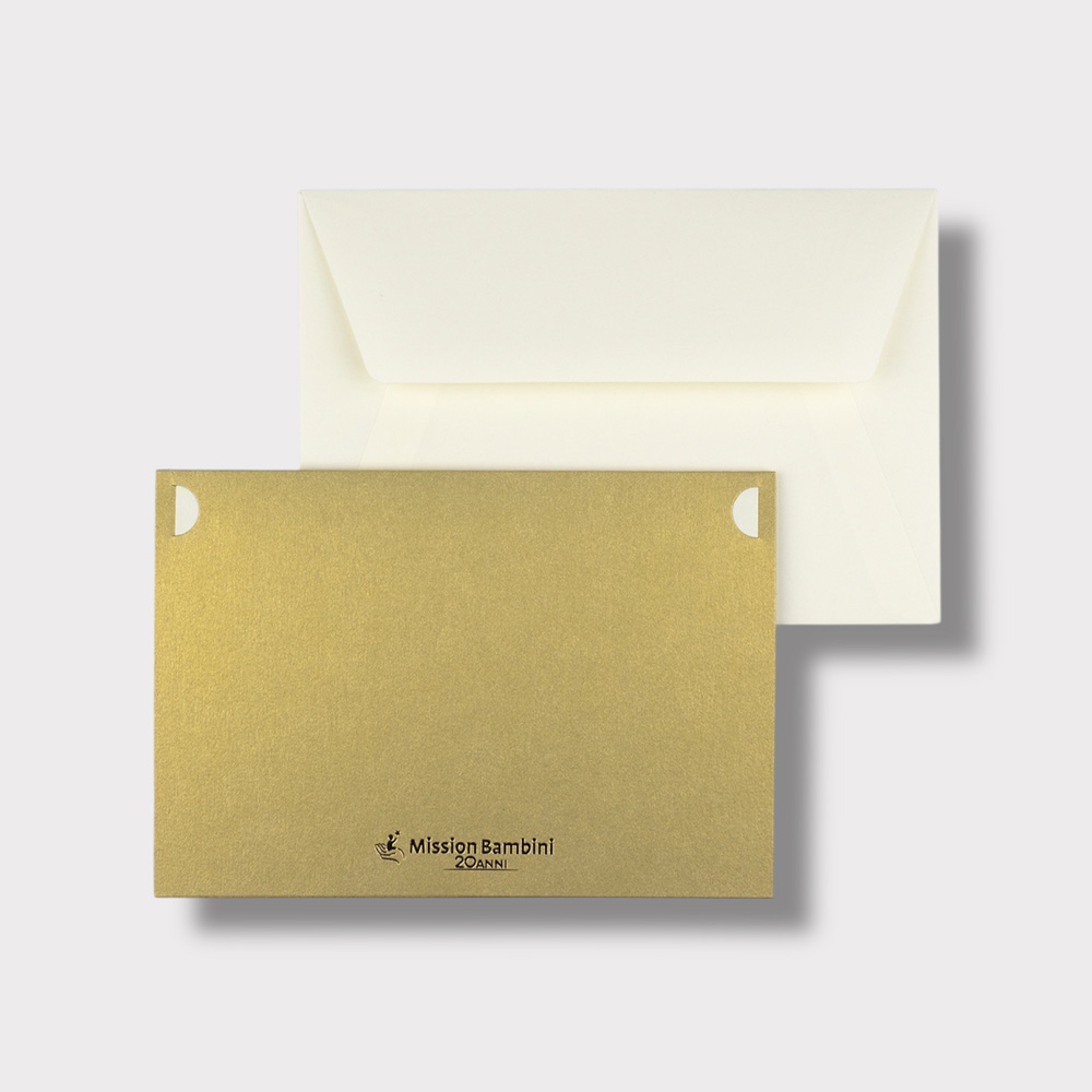 Biglietto augurale in cartoncino metallizzato oro con decorazioni color oro e glitter. All’interno troverai un inserto di carta color avorio da assicurare alle apposite alette su cui potrai scrivere i tuoi migliori auguri e una busta bianca nella quale inserire il biglietto.