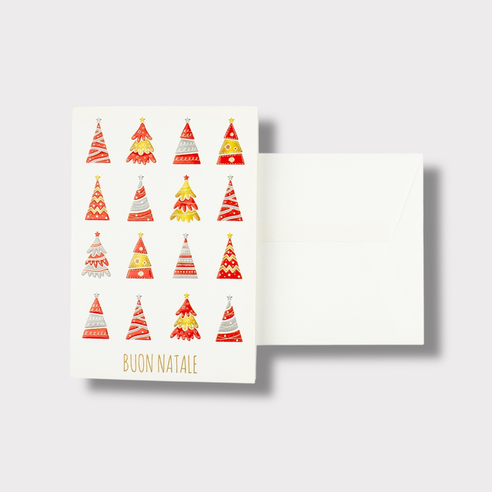 Biglietto augurale in cartoncino patinato bianco con decori natalizi in rilievo realizzati con vernice serigrafica e busta bianca allegata.