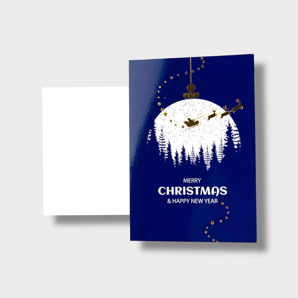 Biglietto augurale in cartoncino patinato con decori natalizi in blu e oro a caldo e busta bianca allegata.