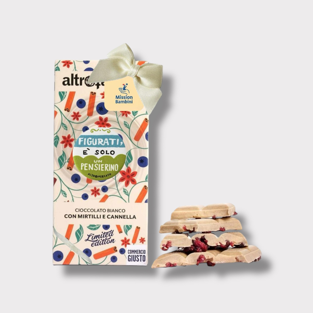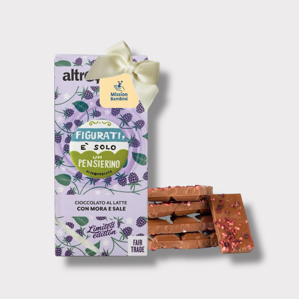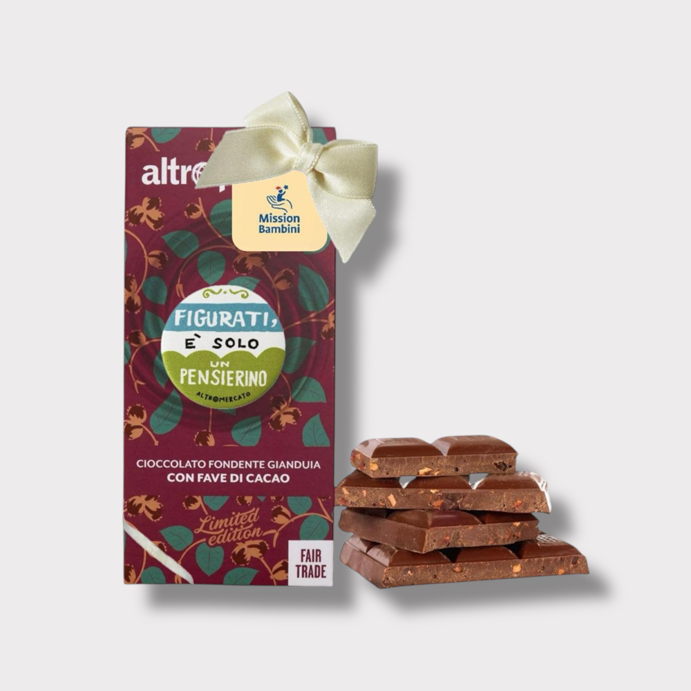 CIOCCOLATO FONDENTE GIANDUIA CON FAVE DI CACAO: cioccolato fondente (*pasta di cacao – *zucchero di canna – *burro di cacao – emulsionante: lecitina di soia – *estratto naturale di vaniglia. Cacao 60% min.) – pasta di nocciole 20% – granella di fave di cacao 5%. Contiene soia e nocciole- Può contenere altra frutta a guscio e latte. CIOCCOLATO AL LATTE CON MORE: cioccolato al latte (*zucchero di canna – latte intero in polvere – *burro di cacao – *pasta di cacao – emulsionante: lecitina di soia – *estratto naturale di vaniglia. Cacao 32% min.) – preparato alla mora 12% (zucchero – mora in polvere – burro di cacao – aromi – regolatore di acidità: acido citrico – sciroppo di glucosio – succo concentrato di sambuco) – sale 1%. Contiene latte e soia – Può contenere frutta a guscio. CIOCCOLATO AL LATTE CON LIQUIRIZIA: *cioccolato al latte (*zucchero di canna – latte intero in polvere – *burro di cacao – *pasta di cacao – emulsionante: lecitina di soia – *estratto naturale di vaniglia. Cacao 32% min.) – liquirizia 2%. Contiene latte e soia. Può contenere frutta a guscio. CIOCCOLATO BIANCO CON CANNELLA E MIRTILLI: *cioccolato bianco (*zucchero di canna – *burro di cacao – latte intero in polvere – *estratto naturale di vaniglia) – preparazione ai mirtilli (mirtilli – zucchero di canna – olio di girasole) 10% – cannella in polvere 1.5%. Contiene latte. Può contenere frutta a guscio e soia. Prodotti di cioccolato da consumarsi entro il 30/04/2026.