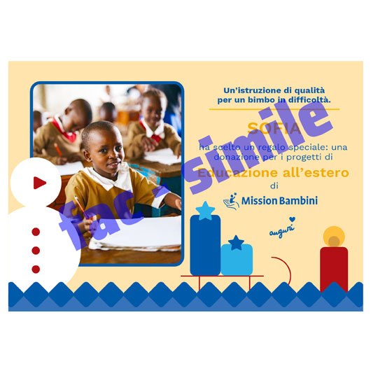 Questo Natale fai la differenza con un regalo di cuore: sostieni i nostri progetti di Educazione all’estero e garantisci ai bambini in difficoltà l’accesso a cure mediche, pasti nutrienti e la possibilità di andare scuola, con libri e divise, in un luogo sicuro dove imparare e crescere.