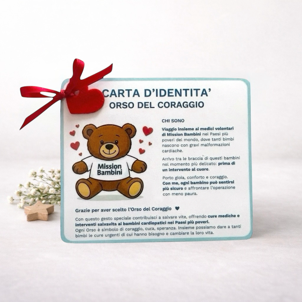 L’Orso del Coraggio indossa una maglietta con il logo Mission Bambini ed è accompagnato da una carta d’identità che racconta la sua storia.